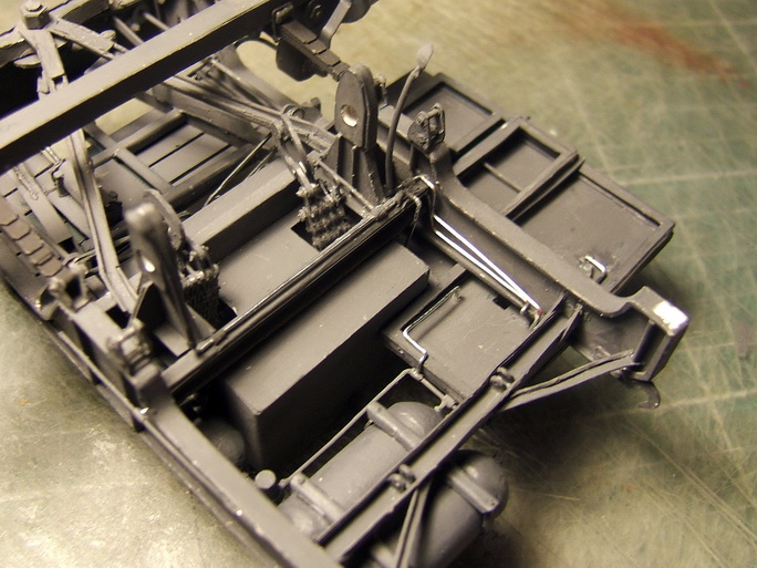 finitions avec mise en place des canalisations d'air conprimé. puis les cables de freins à main. et pour finir montage définitif du train avant A venir les roues que je suis obligé de monter pour pouvoir poursuivre l'amenagement des superstructures. Cela va prendre du temps et donc pas de post avant leur finition