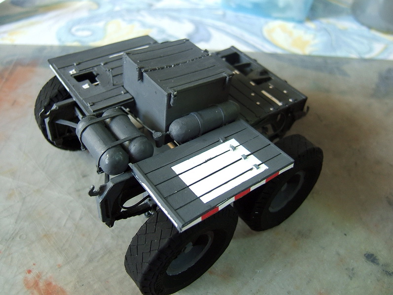 Les roues sont enfin terminées. Pour les détails de montage voir celles du boggie avant. montage et mise en place du platellage gauche. La trappe d'accès à la fixation du timon et aux éléments de commande de direction.