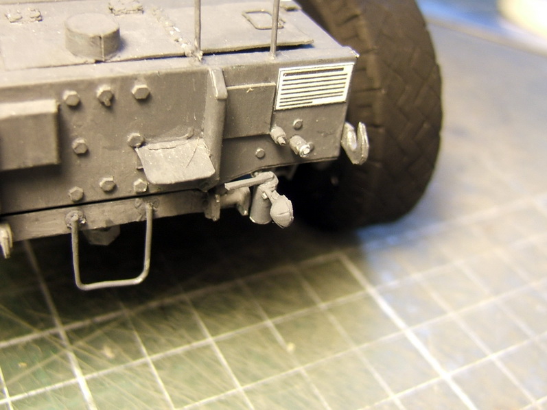 Même ajout sur la poutre arrière du boggie avant. Le support de la roue de secours. avec la pose provisoire de la roue de secours.