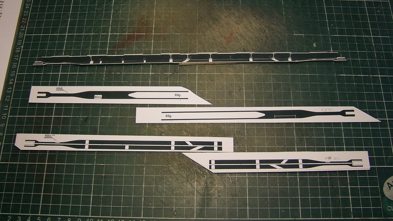 Montage de l'ame centrale avec la face interne collée sur du 0,5 mm. Comme je l'ai précisé précédement les ailes ne tiennent pas sur un A4 donc elle sont réalisées en deux morceaux par face avec une zone de recouvrement.
