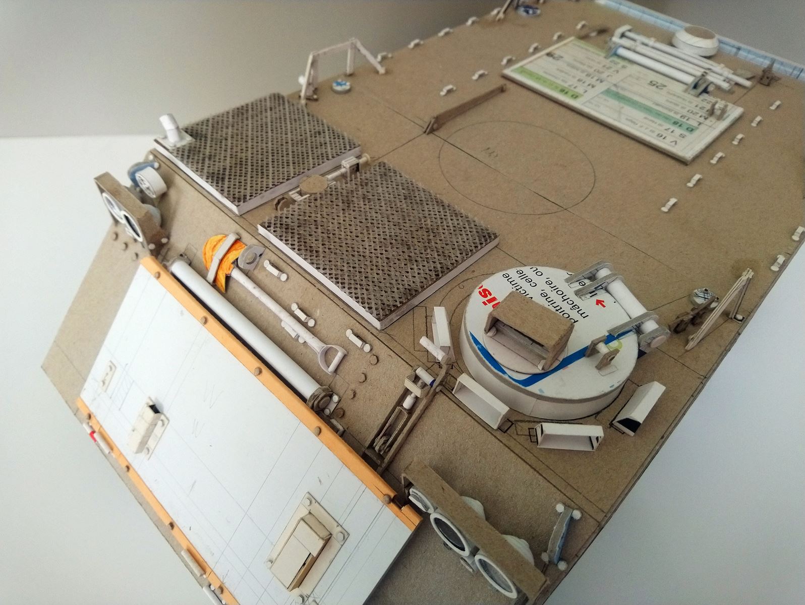 Suite de la construction avec les pelles présente à l'avant : Puis pose des points d'attache sur lesquels viendra le lien maintenant la pelle en place : Construction des grilles d'aération du moteur : Construction du pot d'échappement : A suivre...