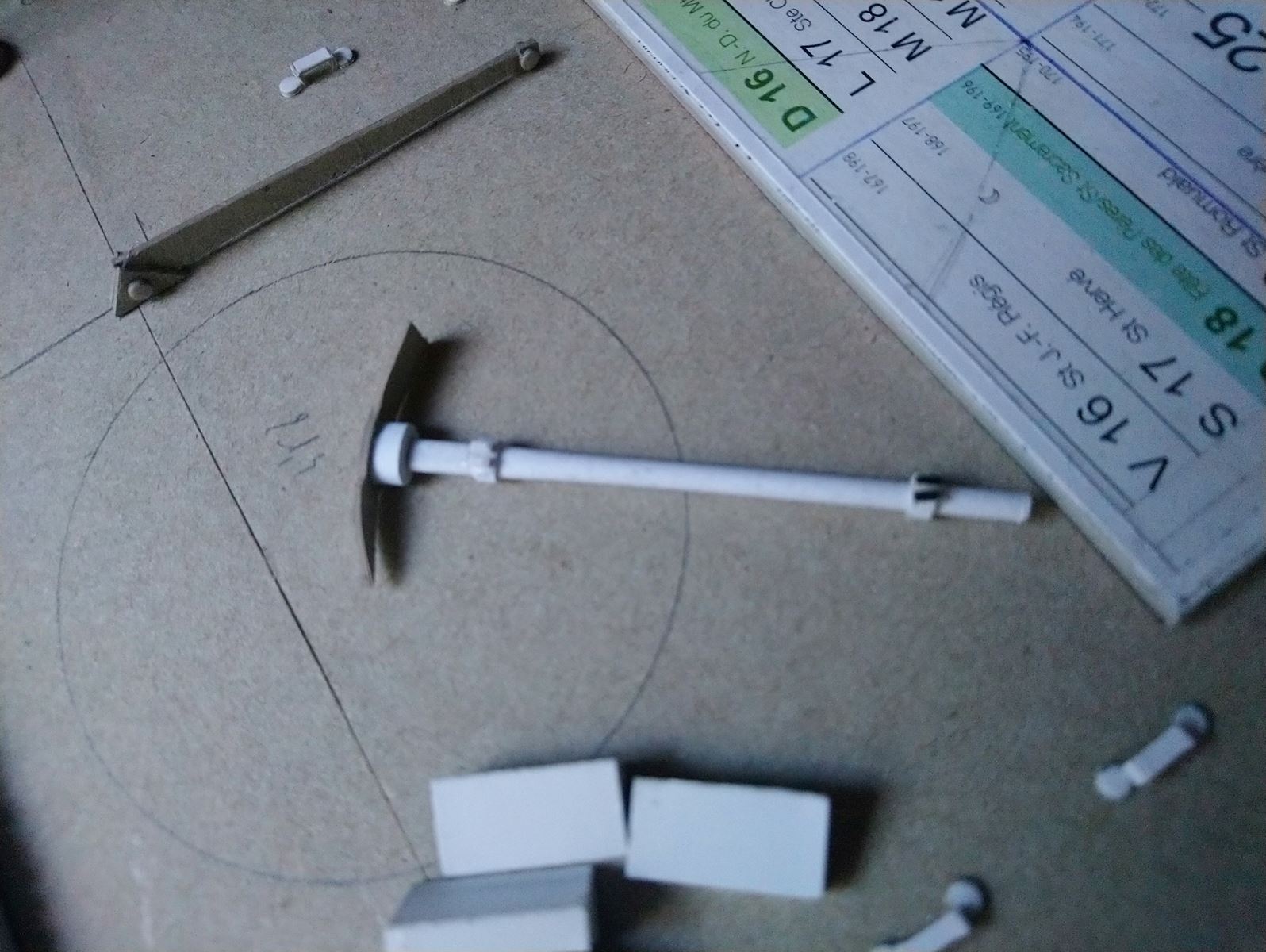 Les grilles de ventilation du moteur ont été revêtues d'un grillage (plastique...) la trappe du conducteur a été construite et les structures des épiscopes ont été confectionnées sans être collées afin de pouvoir les peindre ultérieurement. Le dessus de caisse a été pourvu de la trappe donnant accès à la partie chargement et de tout un tas de poignées et "ornements" divers. Le lot de bord (masse, barre à mine, pioche et hache) a été construit. A noter que le manche de la pioche vient effectivement s'insérer dans le fer. A suivre...