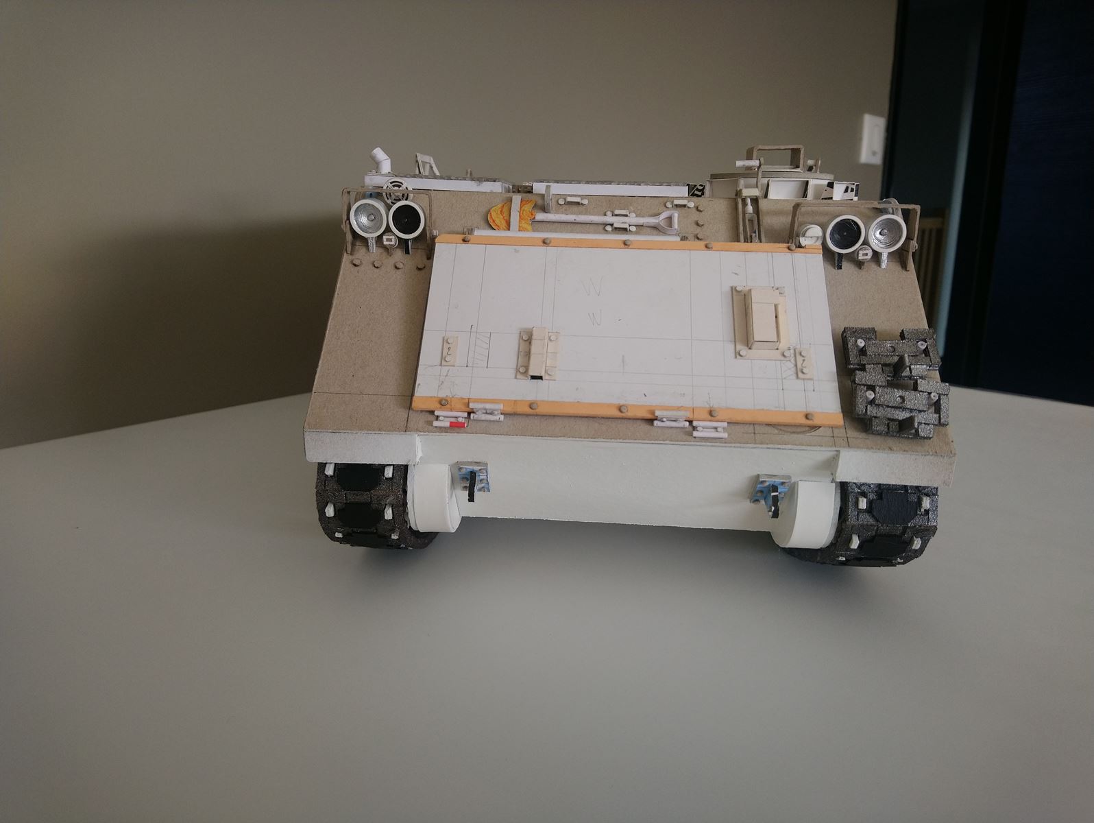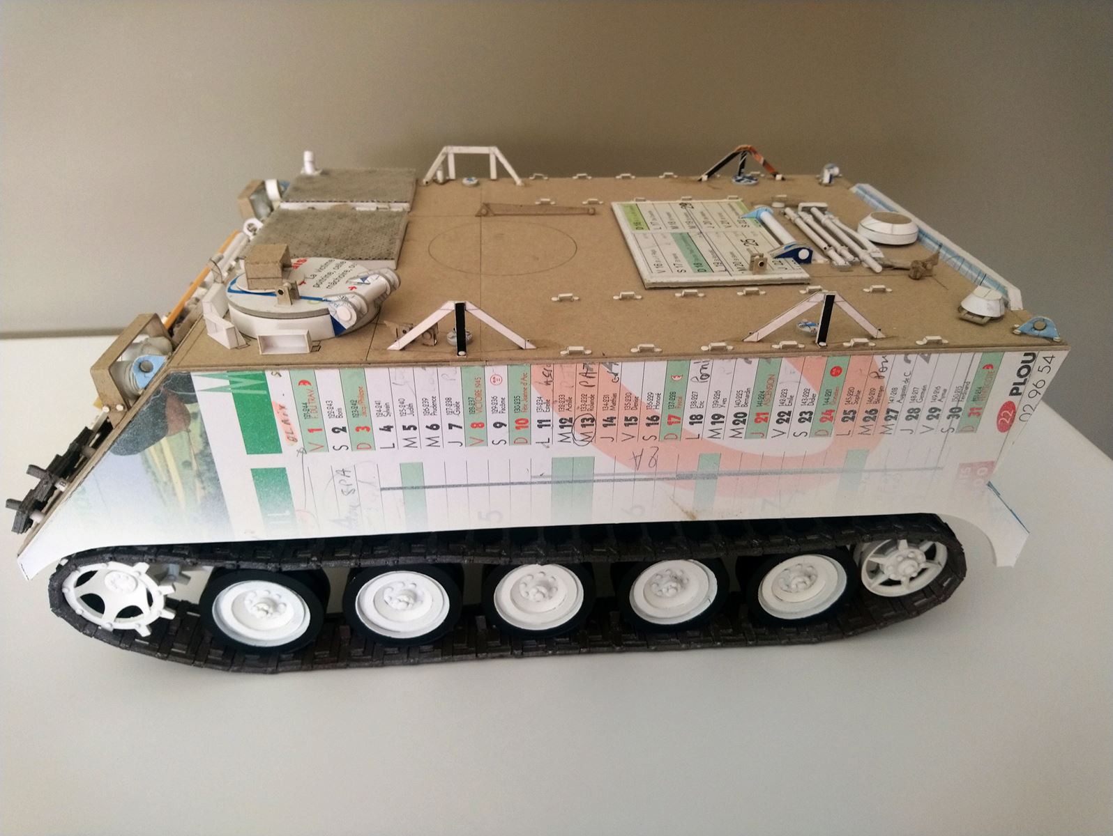 N'ayant qu'une confiance limitée sur la tenue dans le temps d'un angle formé par un morceau de carton simplement plié et jugeant la confection de la protection de la coupole au delà de mes capacités, je me suis rabattu sur un M113 du début du conflit équipé d'une mitrailleuse M2 sans protection et d'un canon sans recul M40a1. Ce qui donne ceci : A suivre...