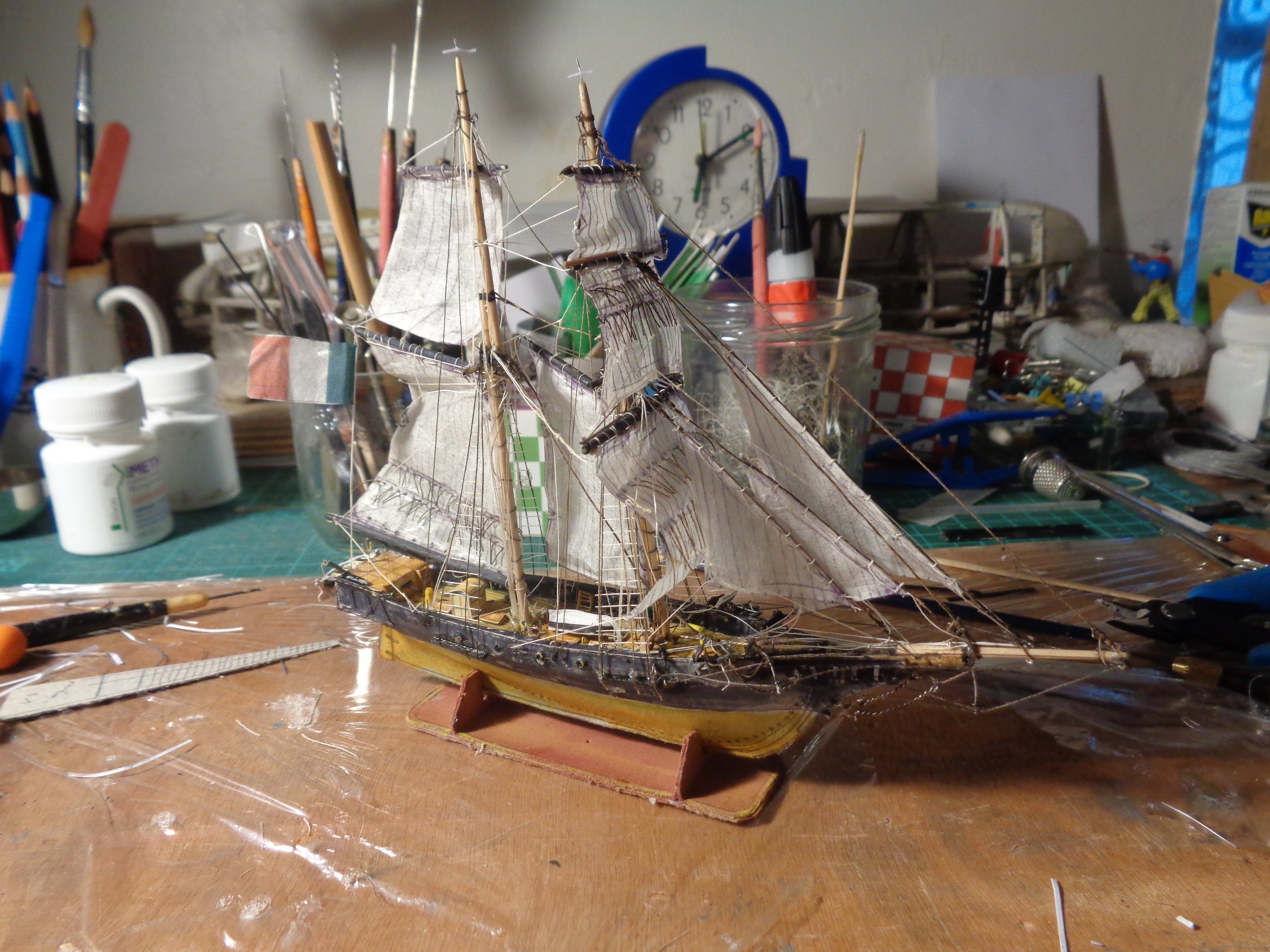Présentation du grand mât, le petit hunier est posé sur la misaine. Les vergues sont tenues par un fil de fer, on peut modifier les positions, voire enlever des sous ensembles. À la fin, on coupe tout ce qui dépasse! Les cornes et le Gui sont collés sur leur fil de fer en laissant un peu d'espace par rapport au mât pour pouvoir les positionner correctement les choses plus sérieuses commencent, les étais de focs sont posés, toutes les voiles sont à leur place. Les focs ne me plaisent pas, mais ils sont comme ceux prévus et puis, on n'était pas sur un bateau de course ou de croisière, mais sur un bateau de guerre... Vue de côté avec un cube repère... Les étais du grand mât sont en place. On comprend pourquoi il ne fallait pas monter tout de suite les haubans et les galhaubans. Comment avoir ensuite accès au pont où aboutissent la plupart des cordages?