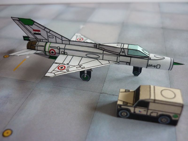 Une petite transformation sur la base du MiG-21 de Rawen et Paran. Il s'agit Fishbed de 2ème génération, un MiG-21FL Fishbed E egyptien de 1967 (guerre des six jours). J'ai peut-être oublié d'ajouter des bandes blanches et vertes sur les ailes.