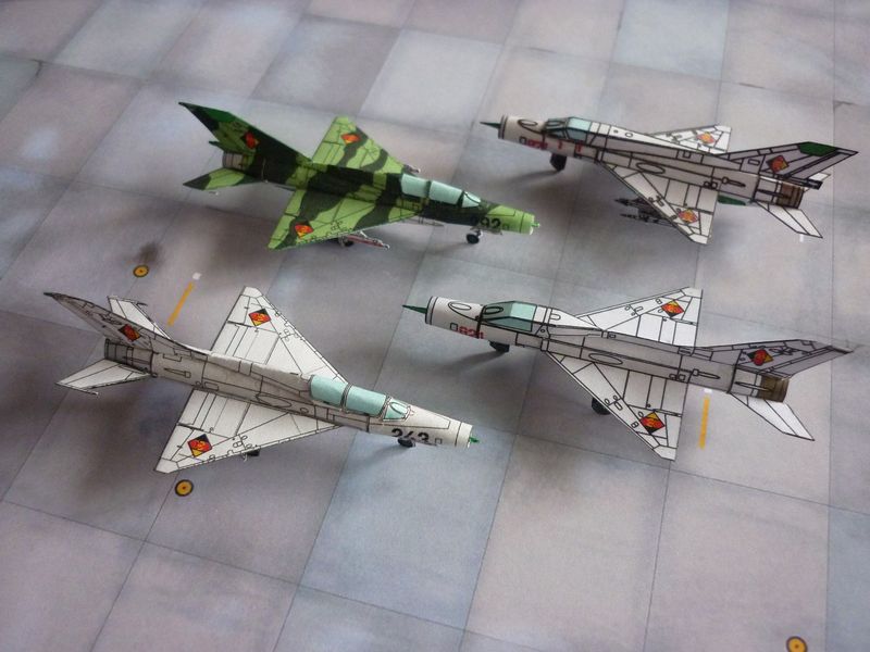 4 MiG-21 d'origines différentes (Fiddlersgreen, Paragon, Rawen & Paran + mon MiG-21U). Le modèle de Fiddlersgreen est clairement plus gros et le 1/250 du modèle de Rawen et Paran est très proche de mon 1/200 (le MiG-21U et le modèle Paragon).