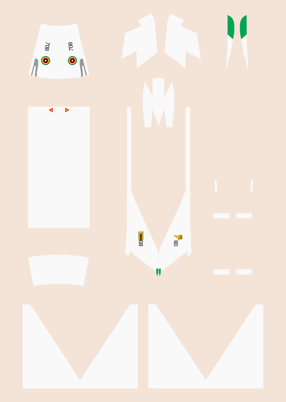 Nigéria. En fait le camo est une variante de celui de Pips (R&P model). Je n'ai aucune photo d'un F-7 nigérian vu du dessus. La livrée est donc hypothétique et est de toute façon fausse pour l'aile droite pour laquelle j'ai bien une photo en légère plongée.