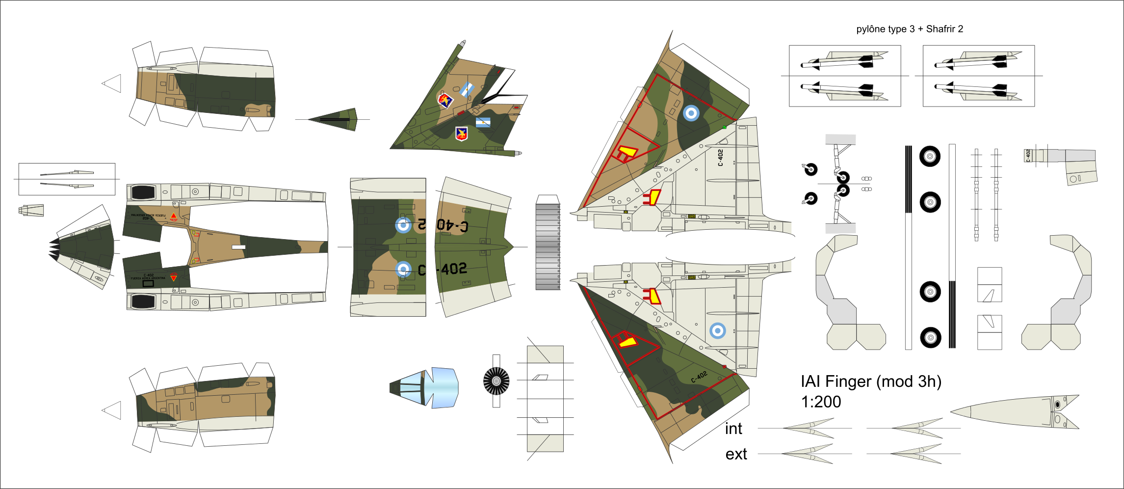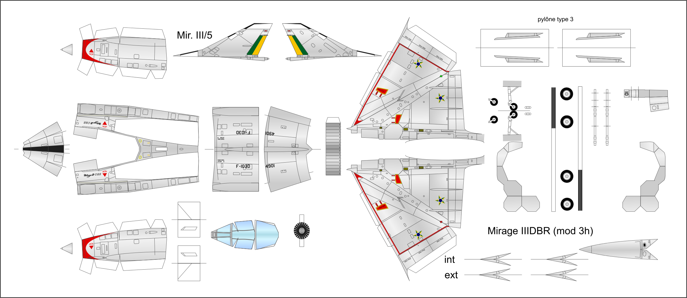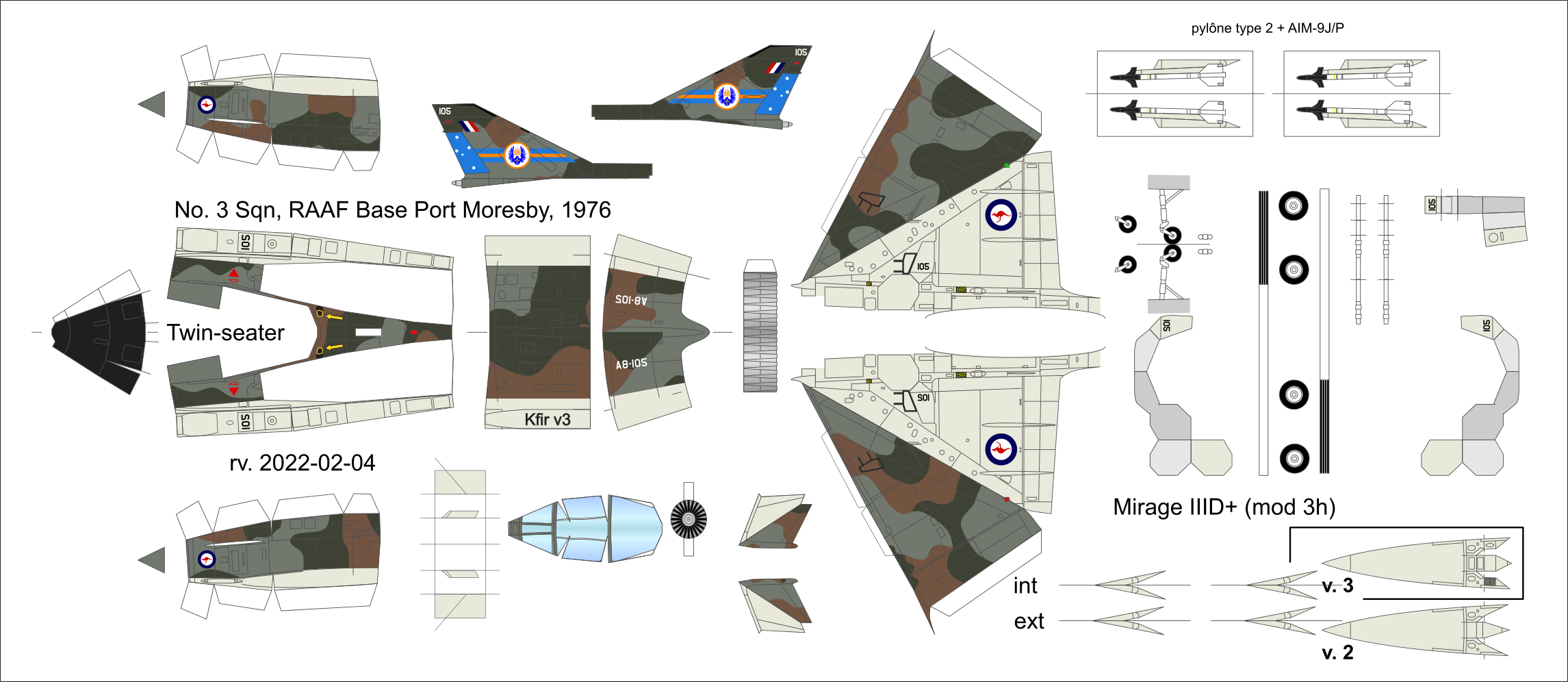 Les Mirage III+, hybride de Mirage III et de Kfir, basés sur une idée de GTX et des profils de Christopher Cooper pour le forum www.whatifmodellers.com, postés il y a 11 ans déjà ! Le biplace est nouveau de ce soir et n'existait pas en profil. Le proto non plus d'ailleurs, ou plutôt seulement en version non coloriée et avec la bosse du radar doppler du IIIE.