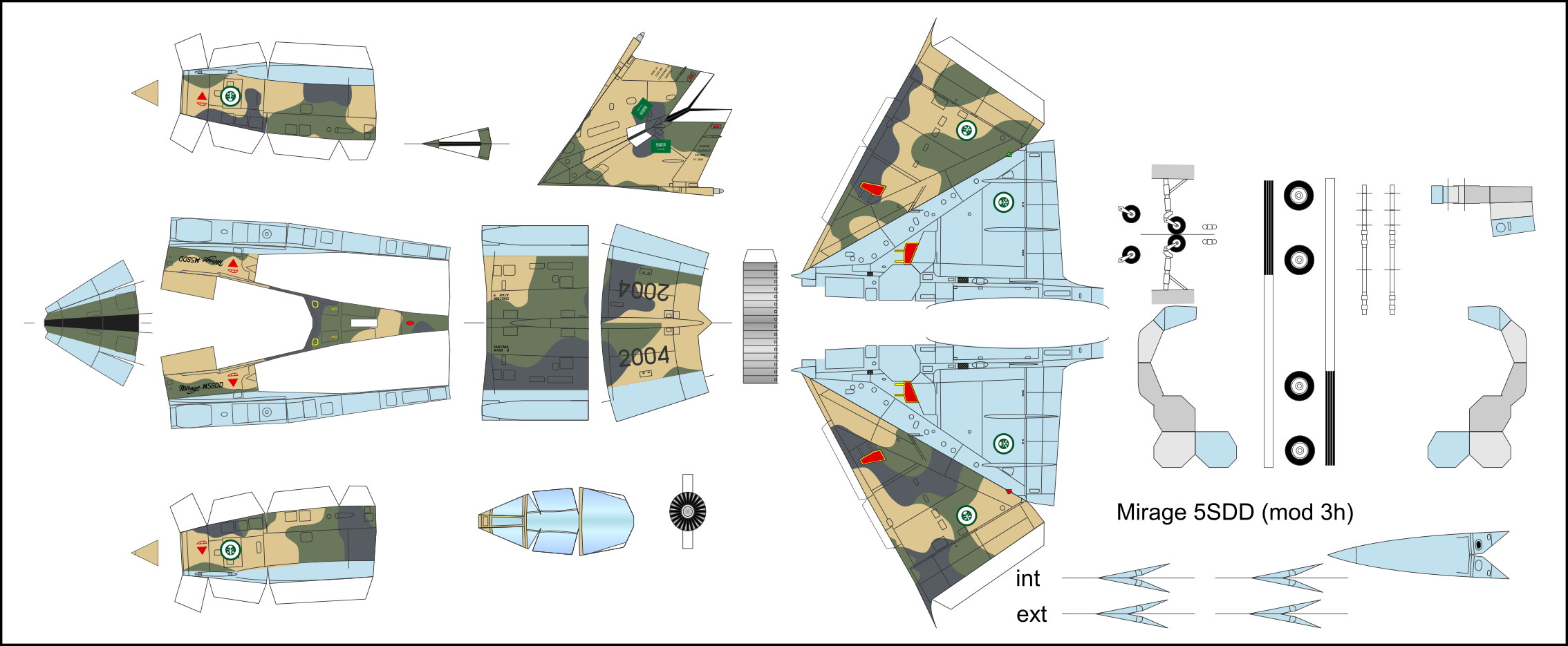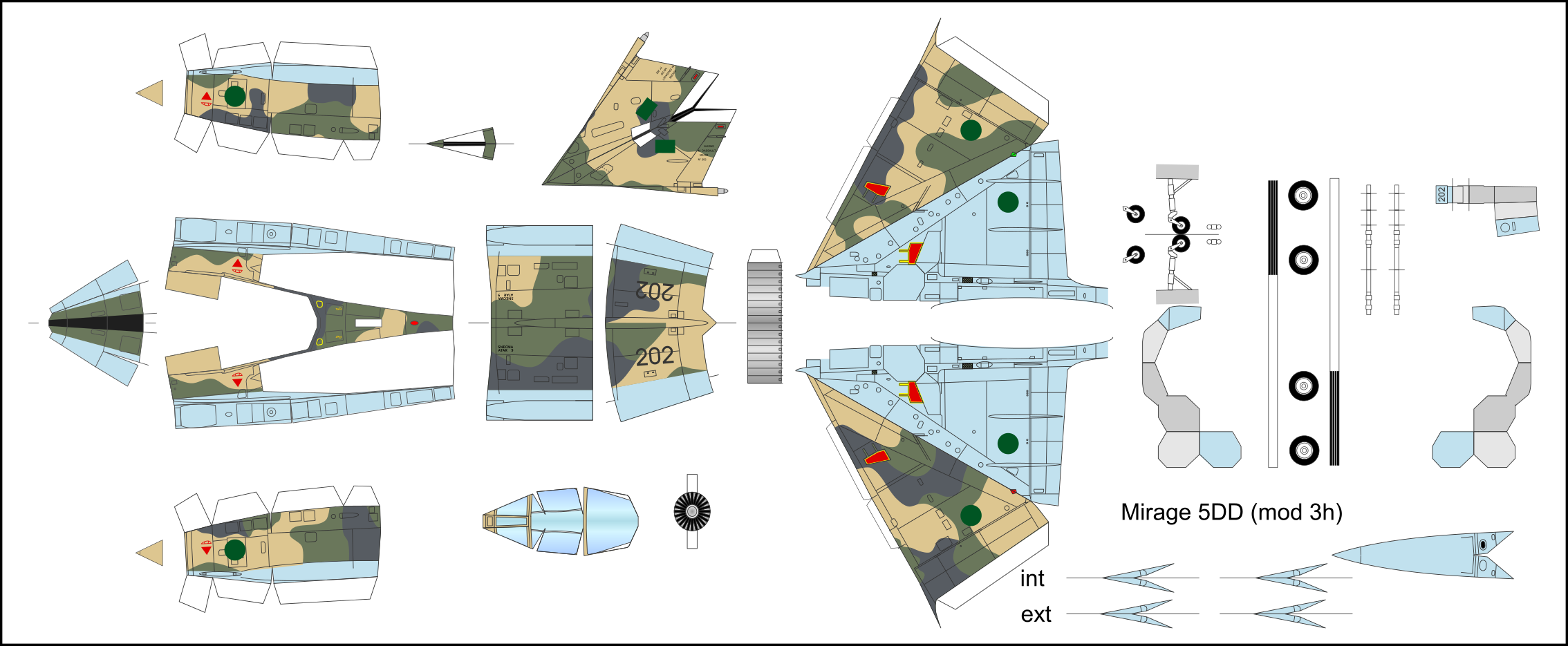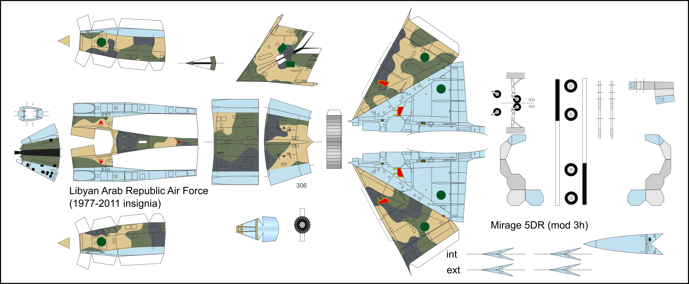 On remplace le nez du Mirage 5DE par celui du 5F ou celui du IIIRD et on obtient des Mirage 5D et 5DR libyens. Les tons verts et sable échangent aussi leur place. Le DE d'interception et le DD biplace existaient aussi dans ce camo "inversé".