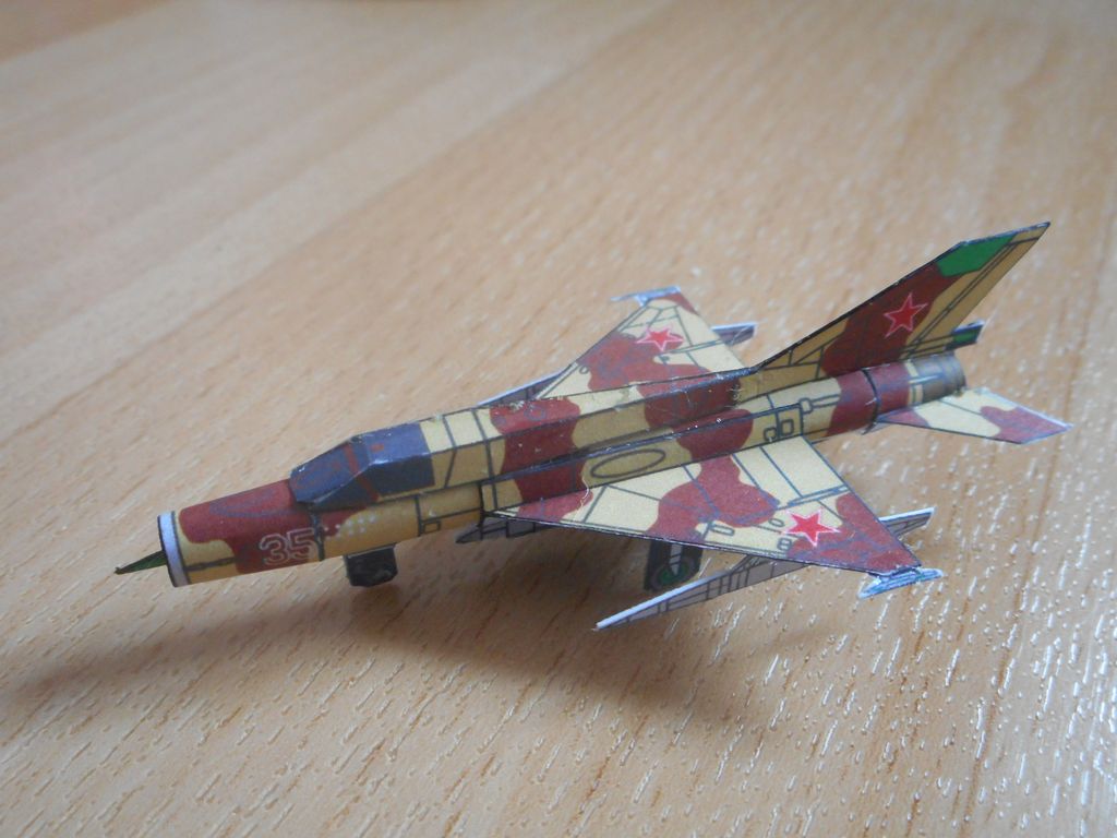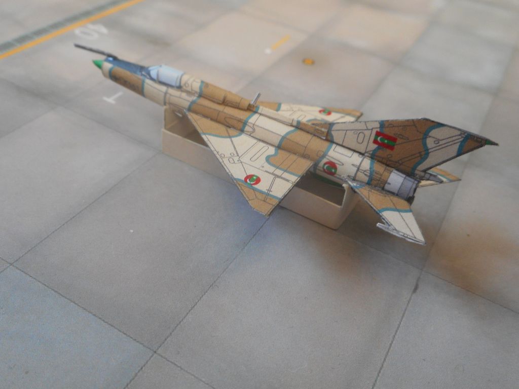 Pas très satisfait de ce montage où j'ai fait quelques bêtises. Ce'st pour ça que le réservoir dorsal laisse à désirer même si j'ai réussi à sauver le parebrise. MiG-21PFS égyptien imprimé au bureau sur le copieur/imprimante laser du service. Couleurs plus sombres que sur ma petite Epson Stylus mais au moins les noirs sont bien noirs !