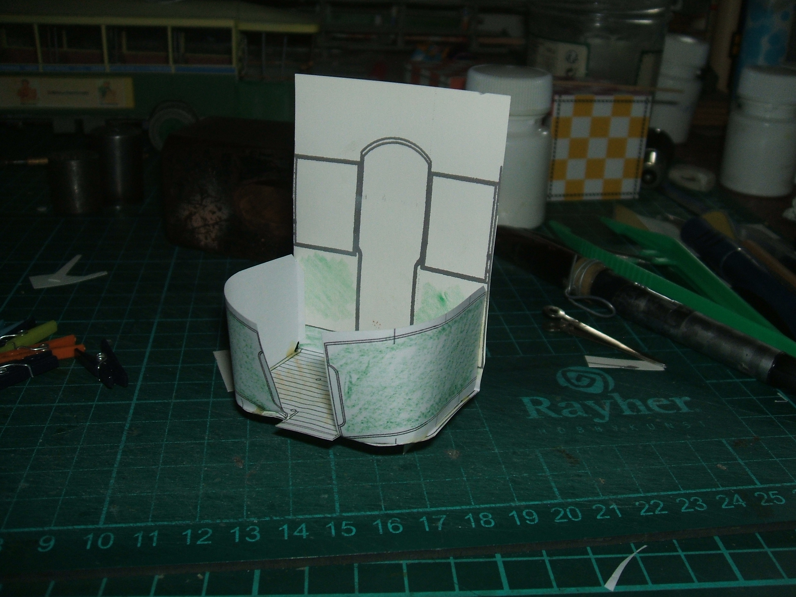 on monte une cabine à partir des planches du modèle détaillé (cabine extérieure; planche 10) avec un gabarit courbe vers le milieu, on colle les cloisons avant et arrière et on fixe le tout sur le châssis Les pièces s'ajustent bien