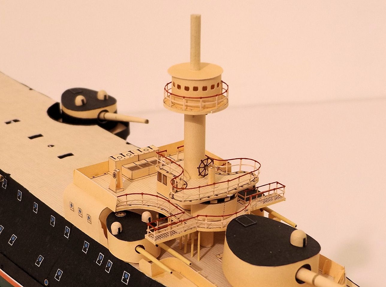 Ensuite.... j'ai attaqué quelques détails de la superstructure avant, en commençant par les canons-revolver Hotchkiss de 37 situés sur la passerelle où se trouve l'abri du timonier et à l'intérieur de celui-ci la roue du gouvernail.
