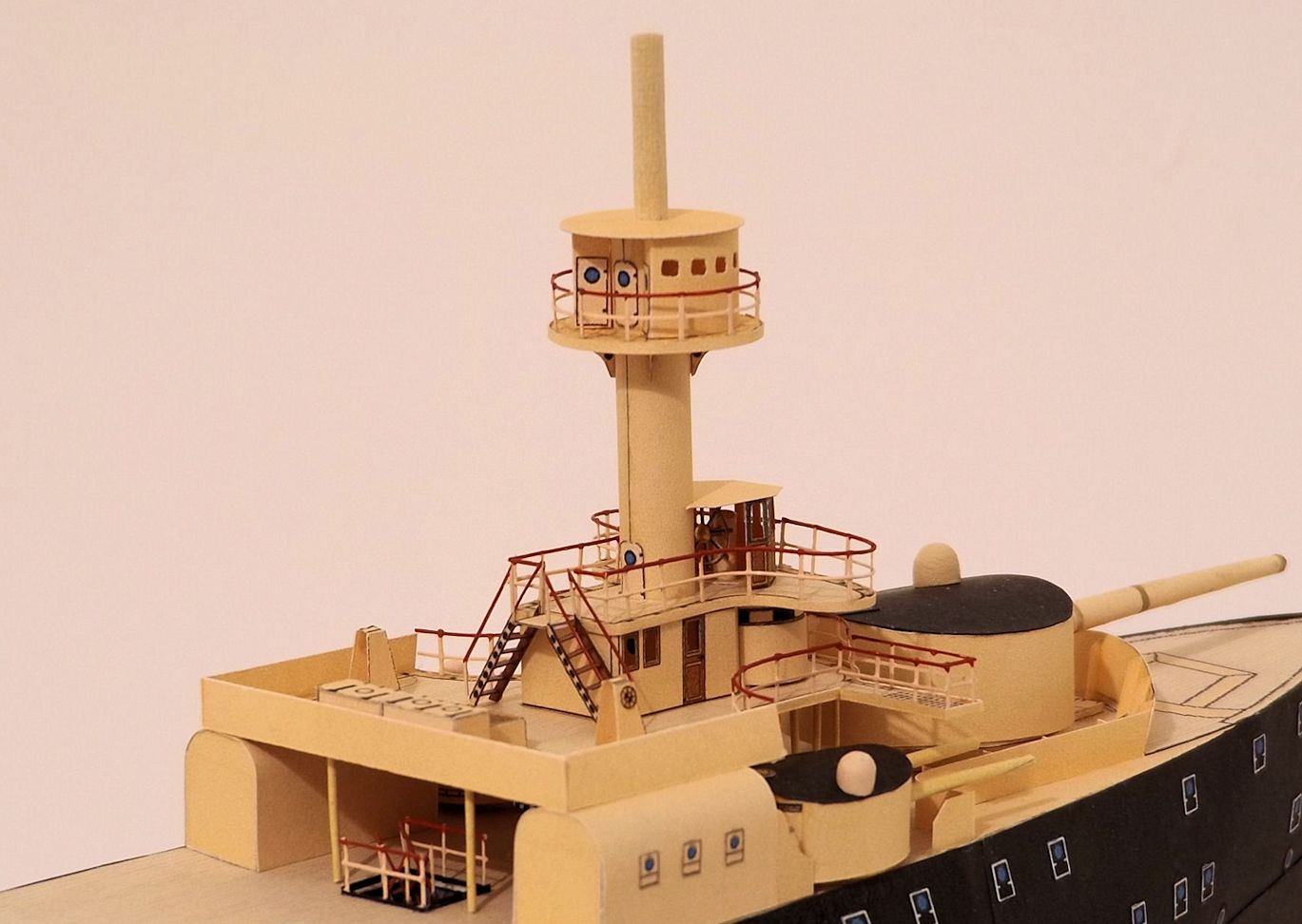 D'abord, les bastingages, et ensuite le réduit blindé de commandement, la salle des cartes, la passerelle supérieure, la barre, l'abri où elle se trouve (l'abri du timonier), et enfin le mât avec le poste d'observation de l'Amiral. Et aussi les deux échelles reliant la passerelle de navigation à la passerelle supérieure, qu'on peut voir sur l'image 138.
