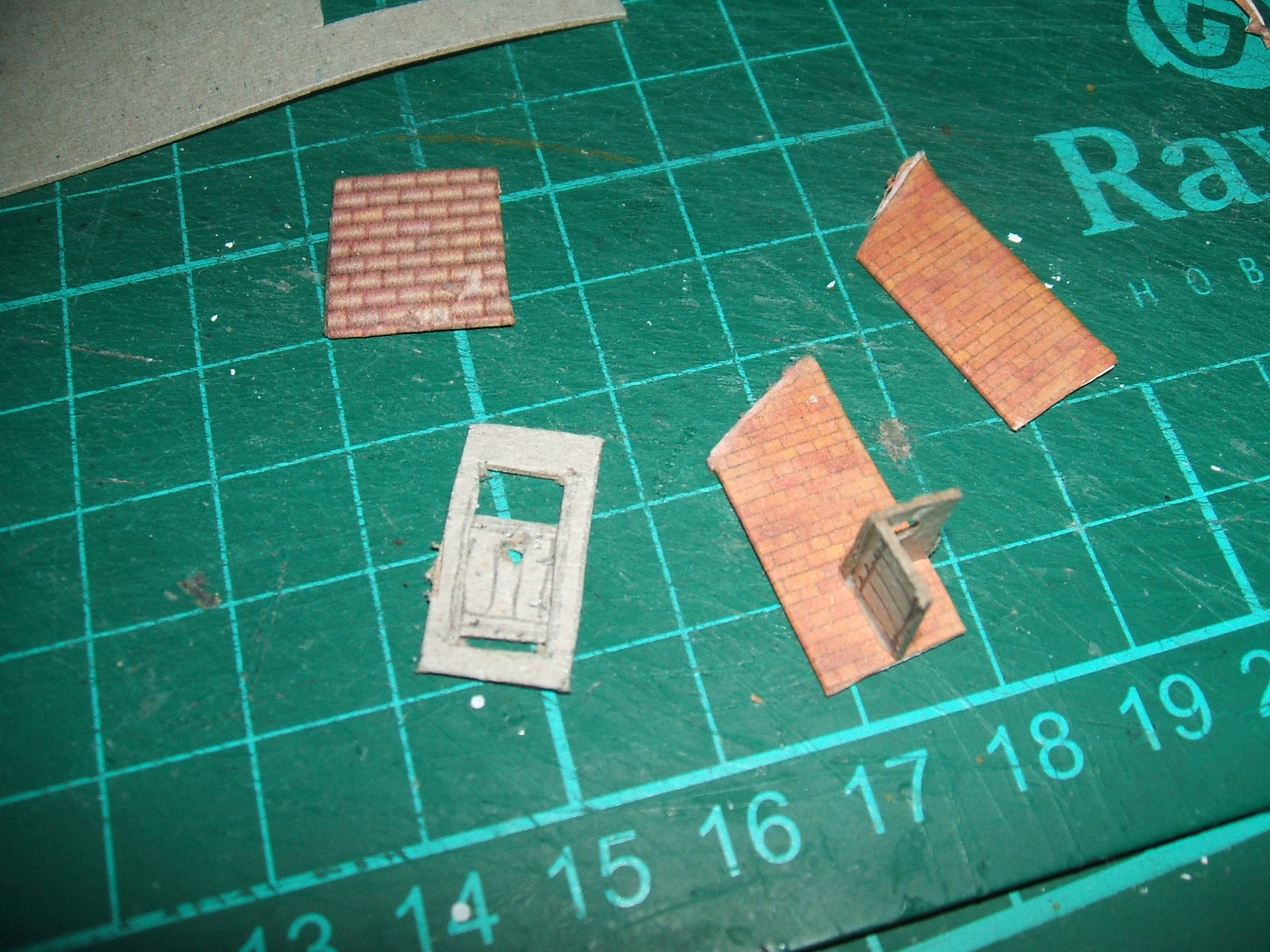 L'entrée avec sa porte; la fenêtre et son volet. Le conduit de fumée masque en partie la commode Le collage des pans de toit sur les gabarits. C'est une bonne solution pour les pentes de toit fortes et le carton épais. Le collage du toit et tout disparaît Noter le calage multiple Mise en forme de tuiles canal sur carton épais mouillé. Ça les abîme un peu et les rend plus réalistes. Les dents de la lame de scie ont été meulées (celles qui restaient) et elle me sert de réglet de coupe. À droite, les mêmes tuiles canal sur du 160g qu'on pliera à l'envers. Le toit bien avancé. On voit de suite l'usage des tuiles canal à l'envers. C'était une solution courante que de cimenter des tuiles pour remplacer des bordures ou des protections en zinc. On a su faire de la brique en grande quantité bien avant le métal. Les chéneaux ont été posés mais n'ont pas été bouchés.On peindra les bordures blanches plus tard.