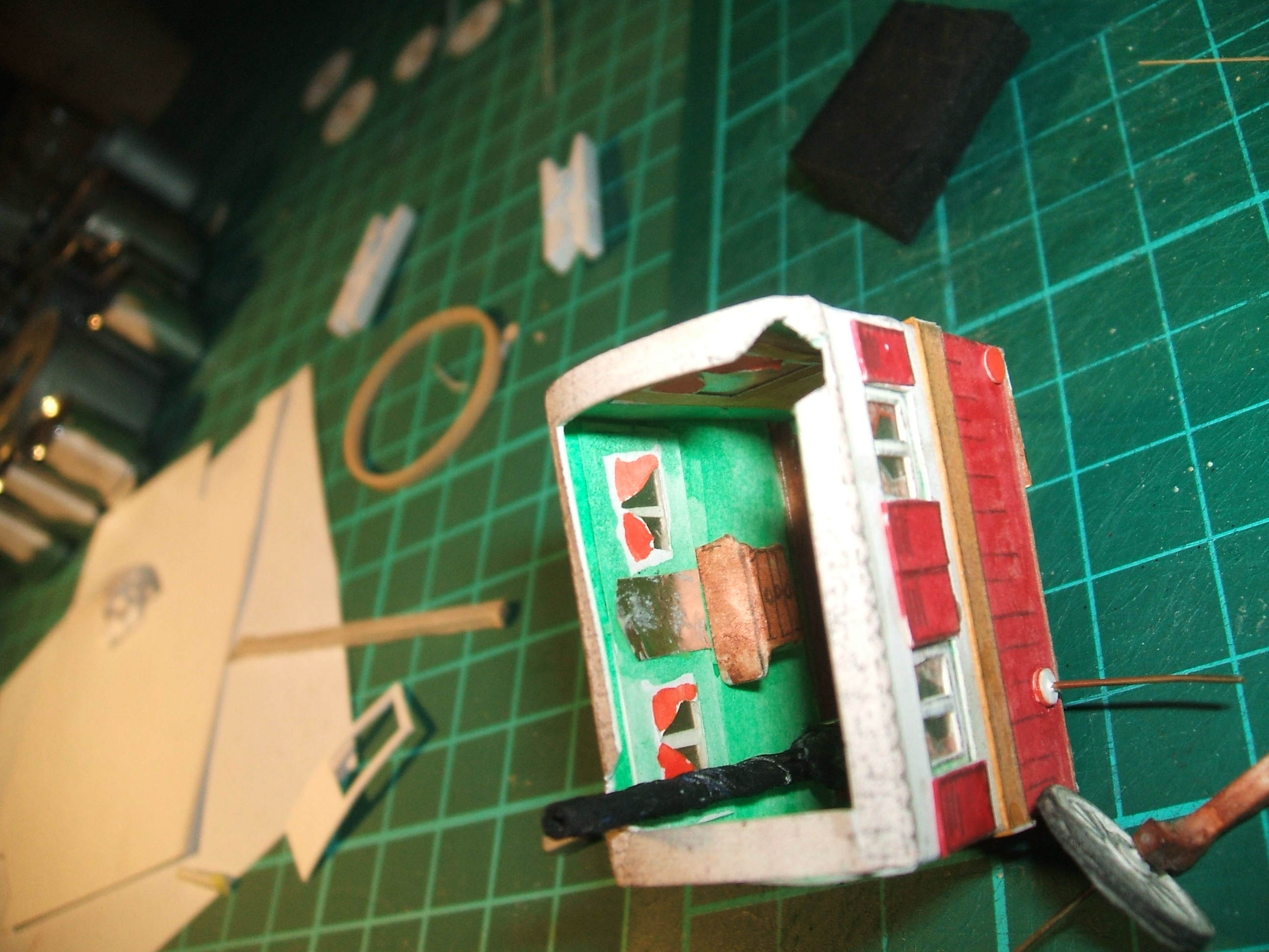 voici l'extérieur de la caisse avec les rideaux découpés dans une des planches imprimées au départ. Notez que le toit a été évidé . Ceci me permettra d'aménager un peu l'intérieur.