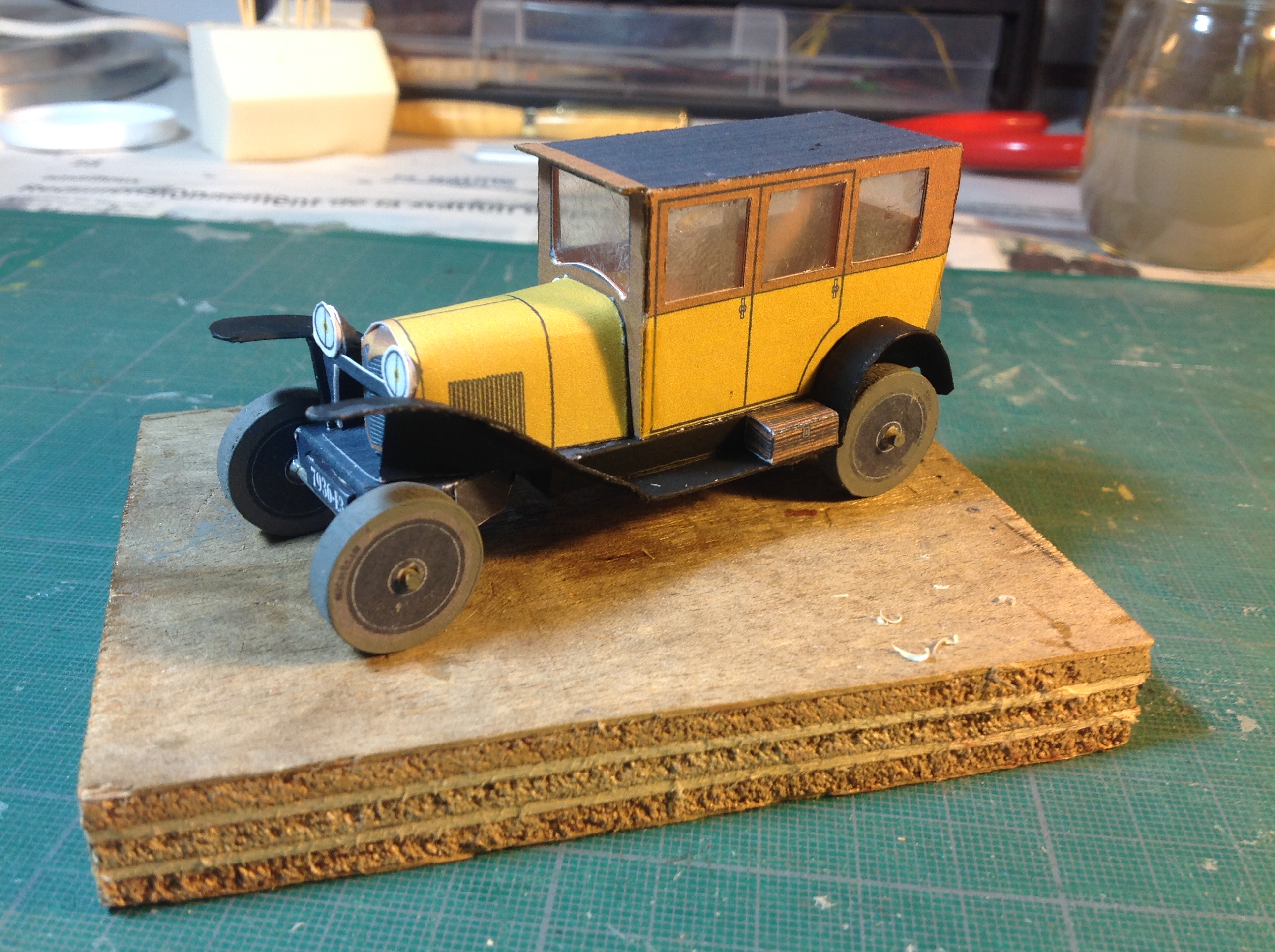 Merci Camille. En attendant tu peux déplacer la poignée de la porte arrière comme sur le dessin de la voiture finie et les tourner toutes horizontalement. Le pare brise pourrait être plus grand avec une barre fine au tiers inférieur et un seul essuie glace côté conducteur; la porte avant un peu plus large, comme la porte arrière qui doit arriver au ras de l'aile, la troisième fenêtre serait un peu plus petite. Tu peux aussi faire le capot en deux parties. Le morceau qui vient contre la caisse a un angle différent de la partie avant.