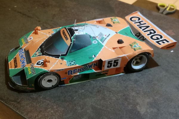 Il s'agit donc de la Mazda 787b proposée par Shinya. Je l'ai trouvé un poil trop détaillée par rapport à l'échelle, avec des bandes de papier très disproportionnée (trop étroites par rapport à leur longueur). Elle m'a donné pas mal de fil à retordre !