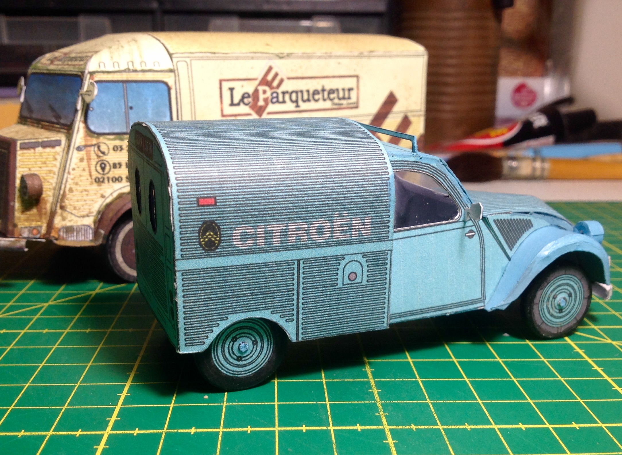 Trouvée en téléchargement gratuit sur le site du créateur japonais Hisa passionné de Citroën. Les ailes avant sont difficiles à monter. J'ai opté pour un collage bord à bord (sans languettes). Des retouches à l'acrylique on été nécessaires. J'ai aussi fait l'impasse sur les pneus que je n'arrive pas à assembler. Je les ai remplacés par des rondelles de depron d'un diamètre légèrement supérieur tournées et passées à l'acrylique noir. Les vitrages en blister de récupération améliorent bien le rendu.