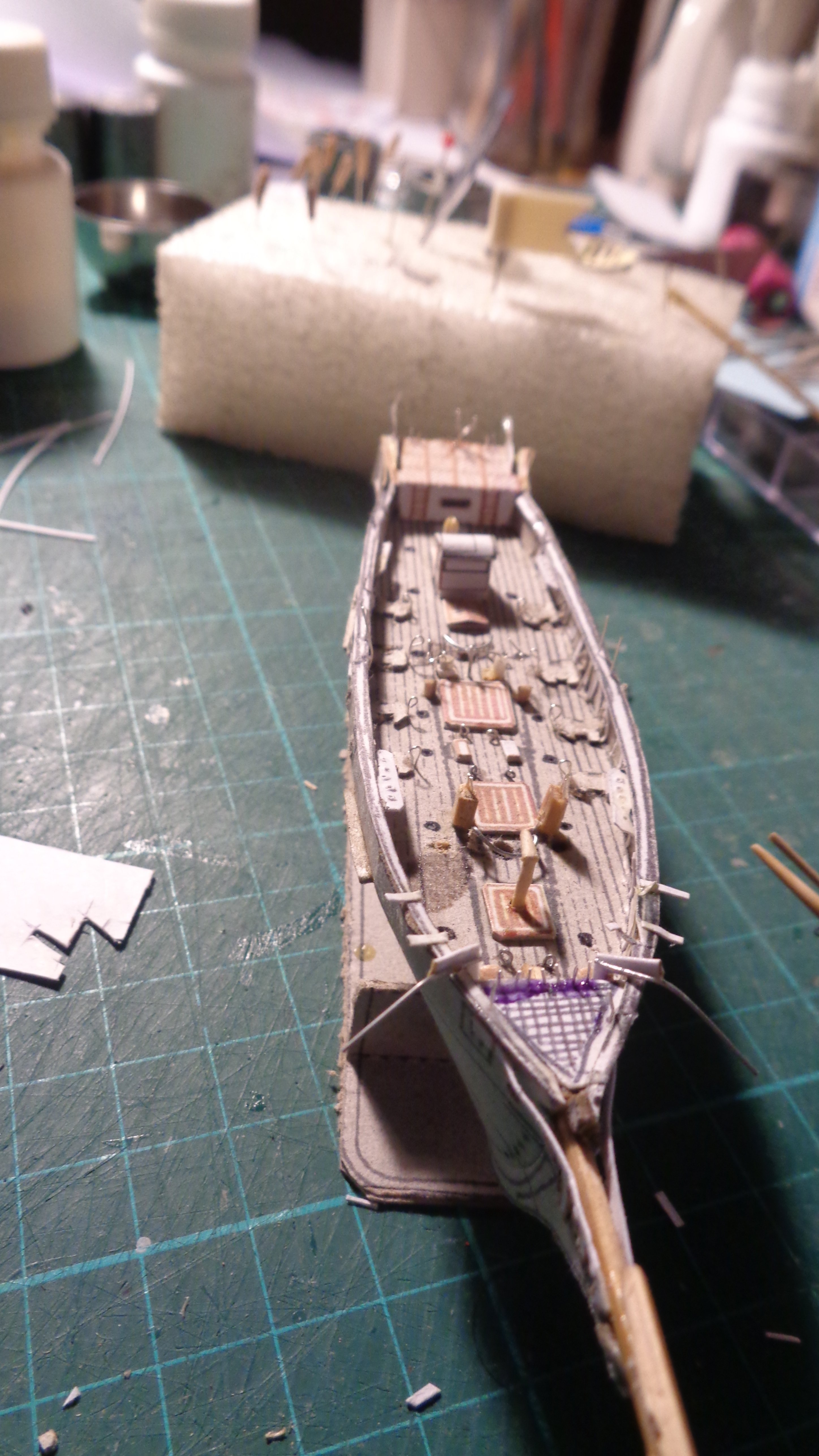 Les trous pour les caronades sont percés, les porte manteaux pour l'embarcation aussi et les potences des ancres sont en place. Ces machins qui dépassent se verront allongés de fil de laiton , de fer ou de cuivre collés à la cyanolit. Les écubiers des ancres sont aussi percés ainsi que les trous pour les mâts, mais plus petits que nécessaire. Les mats feront eux même leur chemin à travers le carton!