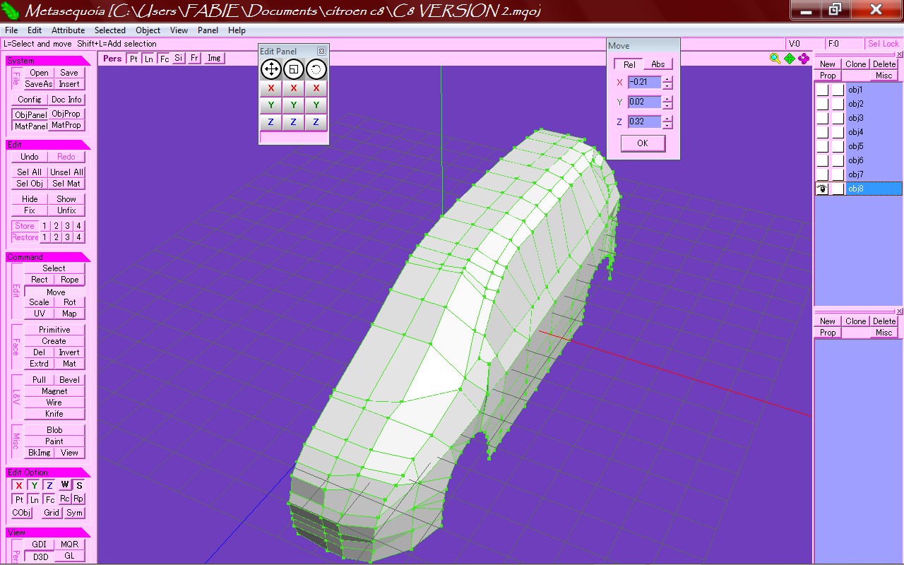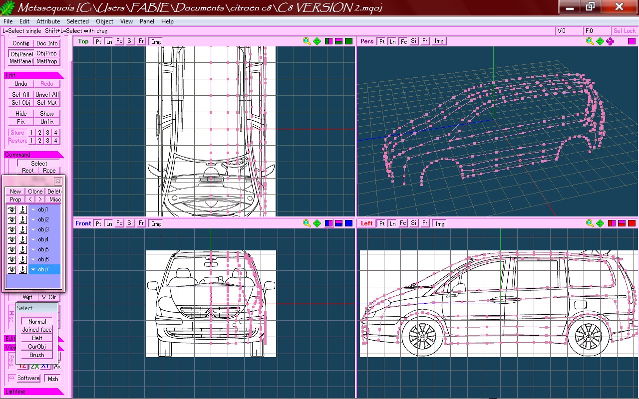 Bon ben voilà je me lance. Ne connaissant rien à metasequoia, j'ai pris les tutos sur le forum et j'ai décidé de commencer le Citroen C8. Je vais bientôt mettre les premières photos de la conception sur meta. Après si des connaisseurs peuvent un peu m'aider car évidemment il y aura forcément des erreurs.